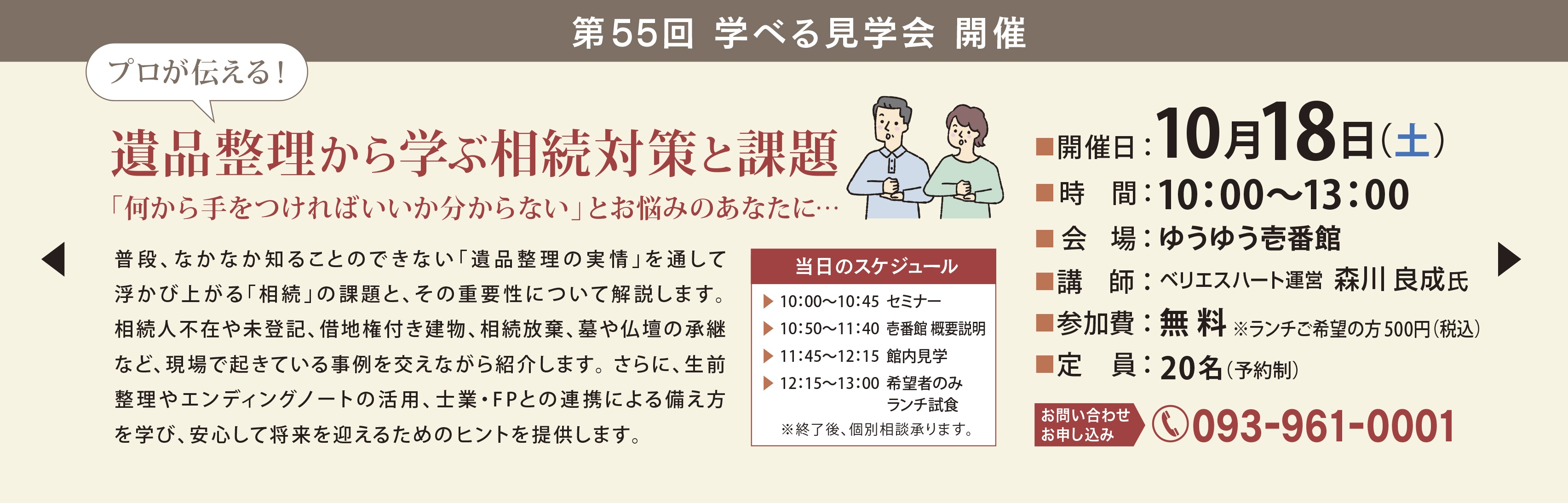 一覧- お知らせ 10月18日(土)学べる見学会のお知らせ ~テーマ「遺品整理から学ぶ相続対策と課題」~