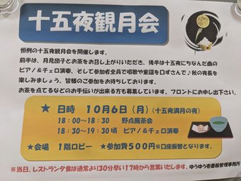 2025年09月30日(火) ゆうゆうフォトアルバム NEW 館内での過ごし方と秋の準備・・・ 「暑さ寒さも彼岸まで」 最高気温が30℃を下回り、秋の風を感じる季節となりました。 ~館内での過ごし方~ 当館では4紙の新聞を取り揃えており、皆様お好きな時間にロビーにお越し下さいます。 暑い日も、広い館内で新聞を読んだり読書をしたりと、涼しく、ゆっくりとお過ごしいただけます。 10月には、入館者様の楽しみなイベントも準備中。 中秋の名月に開催されます。 写真は昨年の様子です。 今年も盛大に企画中です。 以上、看護師からのお話でした。