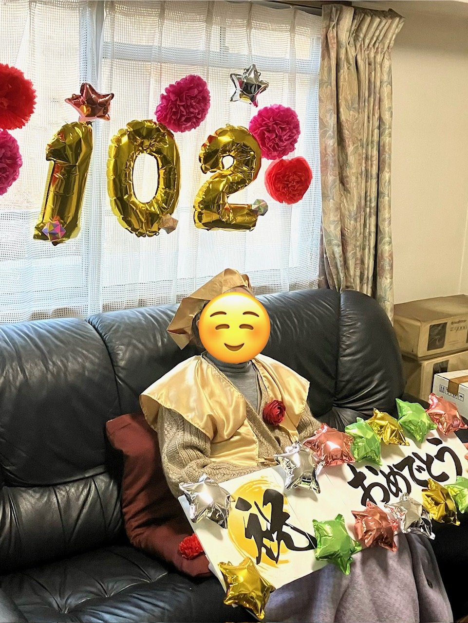 2026年01月20日(火) ゆうゆうフォトアルバム NEW 102歳❣おめでとうございます 入館者さまが102歳のお誕生日を迎えられました。 大正13年のお生まれで当館で最高齢となられました。 当時、日本では前年の関東大震災の復興に当たっている年だそう。 同級生に越路吹雪さん、元総理大臣 村山富市さんなど。 いつもお元気でお一人でエレベーターもご利用されます。 今日はスタッフお手製の「金」のちゃんちゃんこを着てお部屋でお祝いさせていただきました。 お誕生日おめでとうございます!