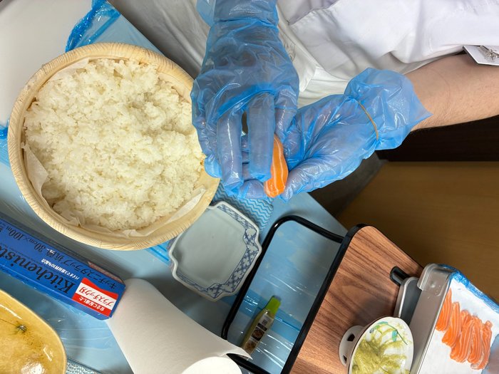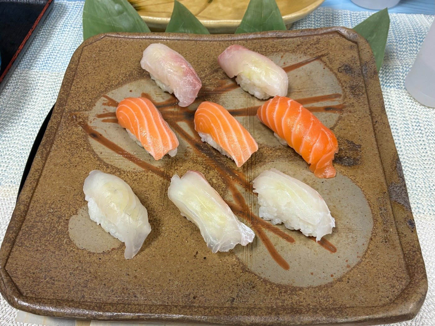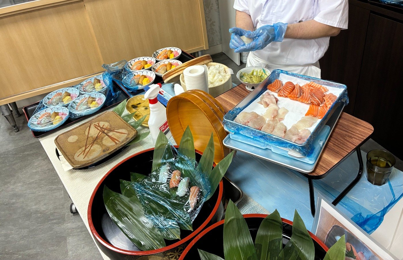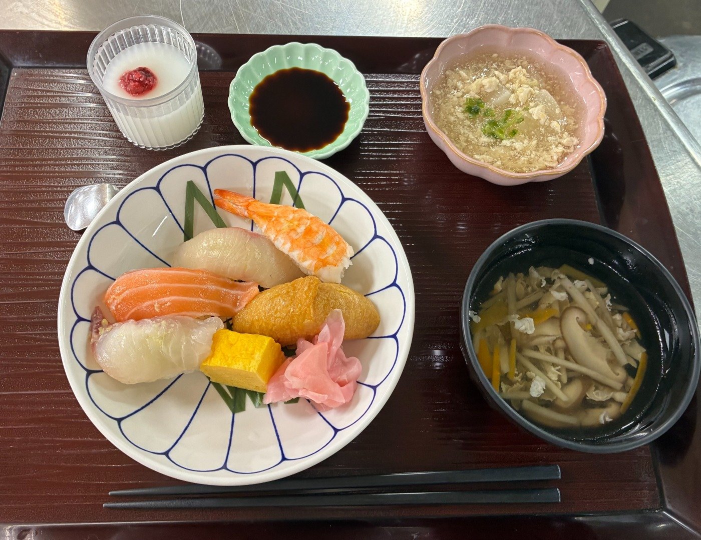 2026年04月23日(木) NEW レストランのライブクック 22日の夕食の時間にレストランでは「握り寿司」のライブクックが開催されました。 レストランの所長さんが一つ一つ丁寧にお寿司を握って皆さんにお届けしました♪ 「鯛・ひらす・サーモン・えび・稲荷」の5種類のお寿司です。 きらびやかなお膳に見惚れながら、みなさんゆったりとお寿司を楽しまれていました。
