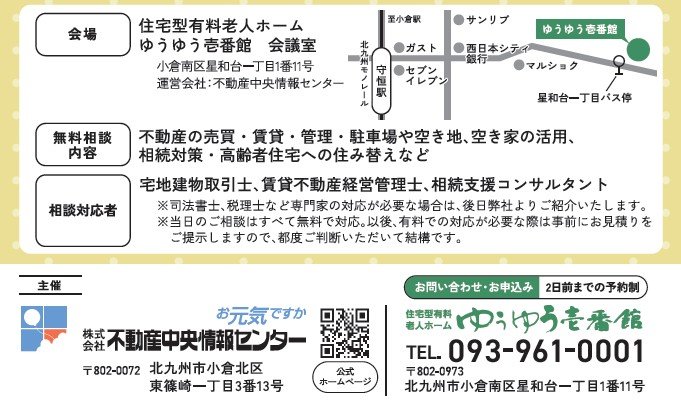 会場は、株式会社不動産中央情報センターが運営する、シニアマンション「ゆうゆう壱番館」で、宅地建物取引士、賃貸不動産経営管理士、相続支援コンサルタントなどの資格者が対応します。